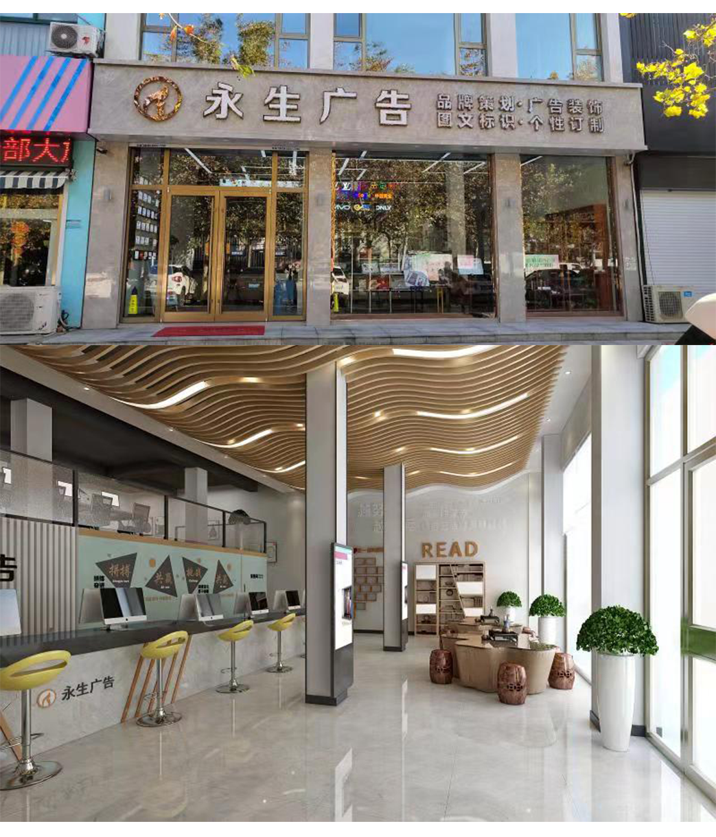 公司自有數(shù)碼沖床設備、500W光纖機、高精度大幅面噴繪機、寫真機、UV機、多種大小型雕刻機、吸塑機、全自動圍字機、自動開槽機、激光焊接機、拋光機等生產(chǎn)加工設備,擁有完善的設計團隊、技術(shù)團隊、施工團隊、售后團隊,可為廣大客戶提供室內(nèi)裝修、店招門頭、精神堡壘、黨建標識、標識標牌、宣傳欄、LED顯示屏、警示標識、精品字、證卡胸牌、證書獎杯、燈箱、桌牌、定制禮品、展具、噴印等多種專業(yè)廣告服務...